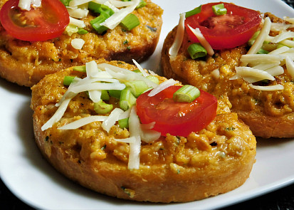 Po chvíli otočíme a dosmažíme z druhé strany. Odkládáme na papírový ubrousek odsát přebytečný tuk. Přizdobíme zeleninou a podáváme teplé. Kdo nechce smažit, stačí dát chlebíčky krátce zapéct do trouby.
