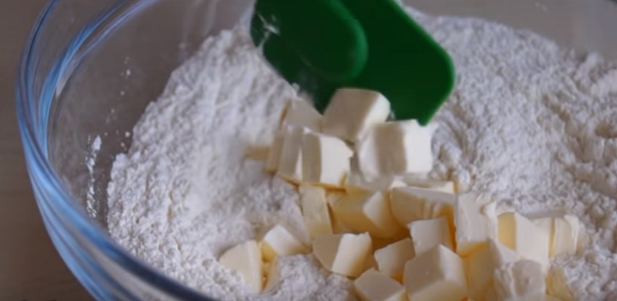 Do hluboké mísy nasypejte hladkou mouku a lžičku prášku do pečiva. Přidejte špetku soli, 2 lžíce cukru, vanilkový cukr a všechny suché ingredience důkladně promíchejte. Pak přidejte změklé máslo předem pokrájené na malé kostičky a rukama vše prohněťte a zadělejte písčitou a drobivou hmotu.