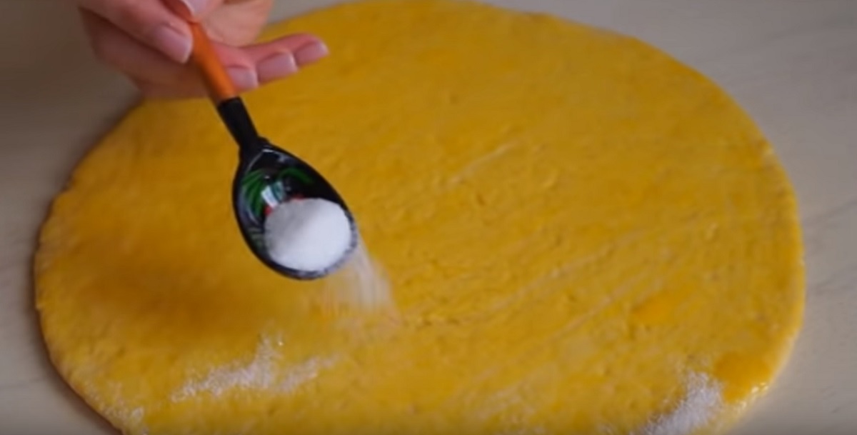 Do malé mističky vyklepněte vajíčko a vidličkou ho rozšlehejte do jemné pěny. Tou pak s pomocí silikonové štětky pomažte celý povrch těstové placky a zasypejte ji třemi polévkovými lžícemi cukru.