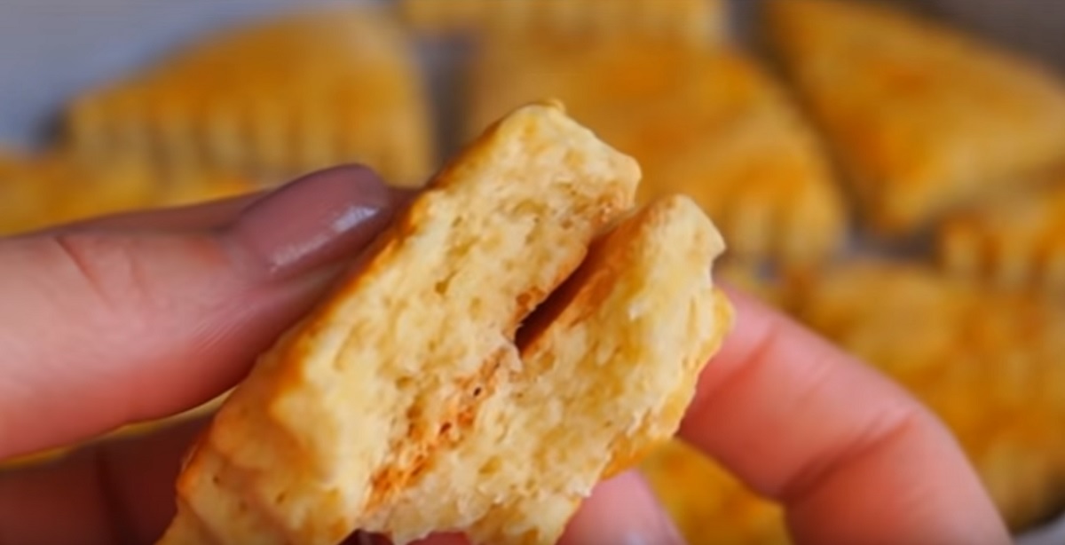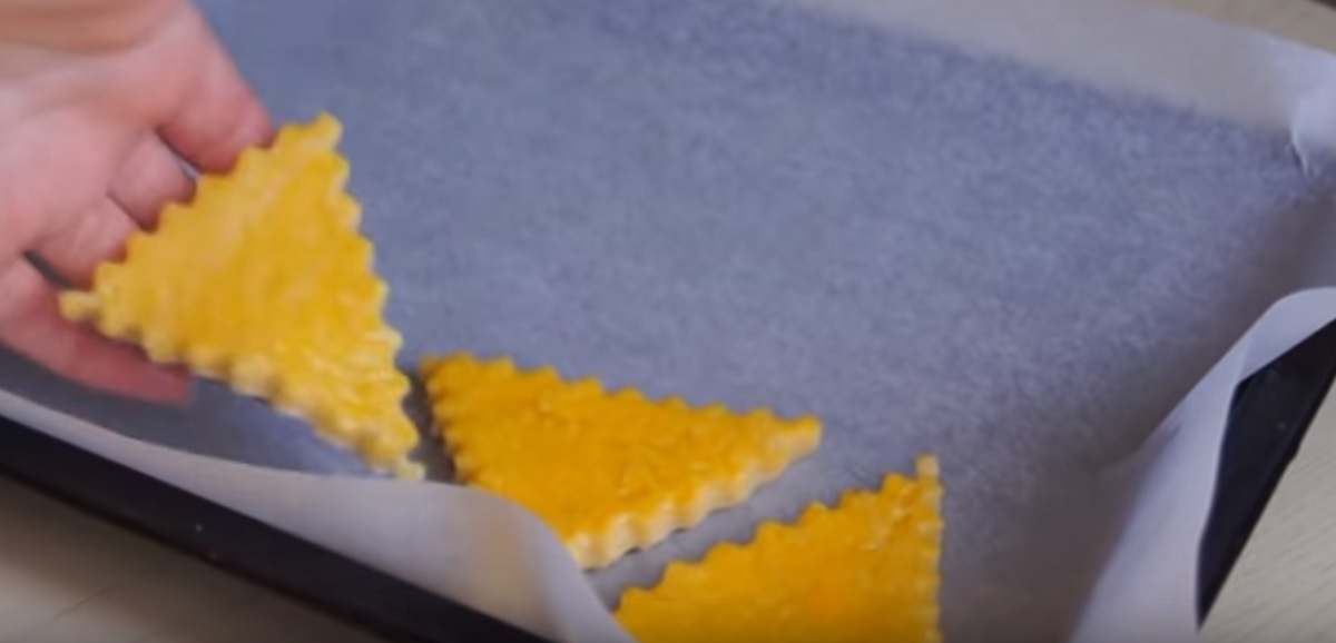 Zapněte si troubu, aby se zahřála na 180 °C a plech vyložte pečicím papírem.Cukrářským zubatým rádýlkem, případně kráječem na pizzu, rozporcujte těstový plát na malé trojúhelníčky, čtverečky či kosočtverečky, podle toho, jak se vám to líbí, či jak se vám to podaří.